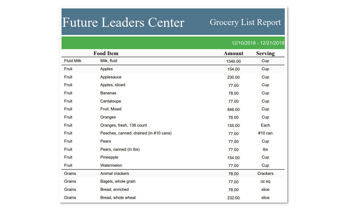 2. If you are using My Food Program, you can skip the math and just run the Grocery List Report. It pulls together your food quantities and lists them out by category: